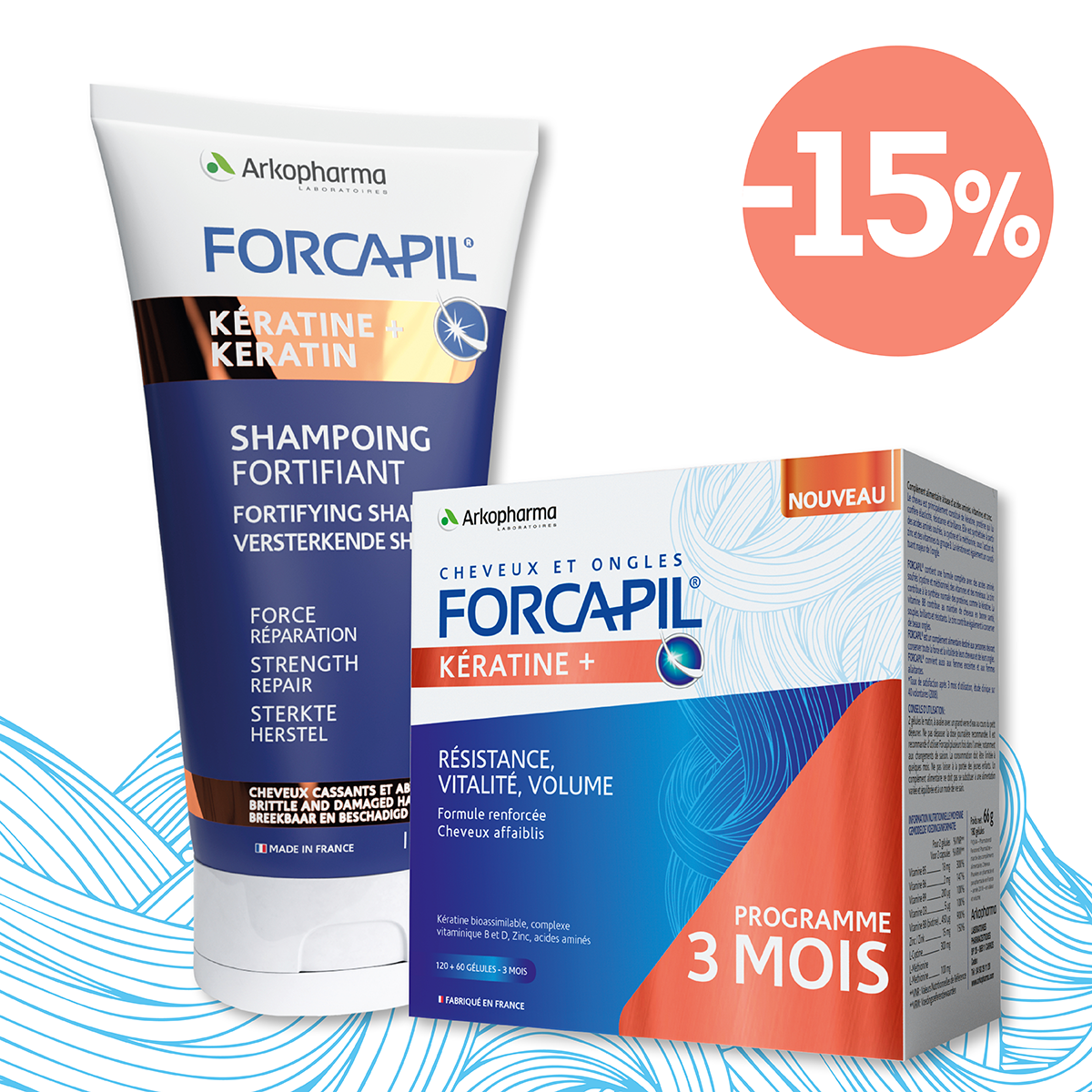 Három havi kezelésre elegendő Forcapil Keratin+ Hajerősítő és regeneráló kapszula, kiegészítve egy Forcapil Keratin+ hajregeneráló samponnal